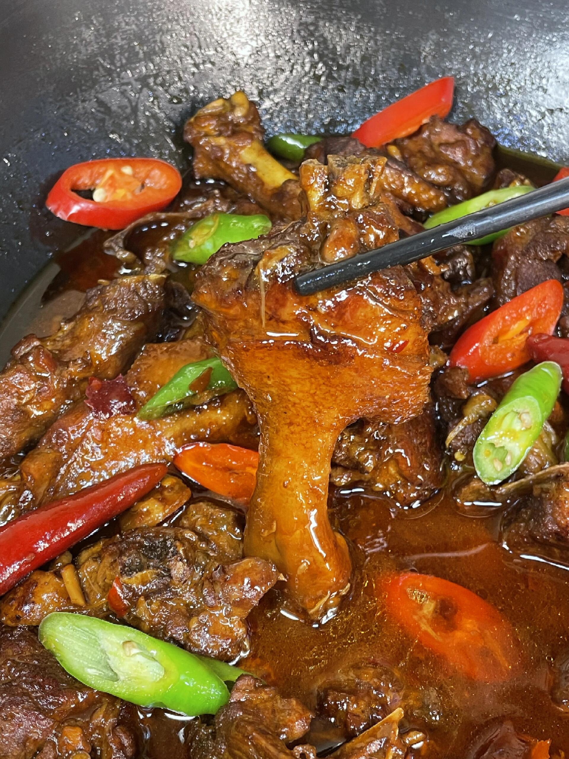 接下来,我们开始施展魔法。锅烧热,倒少许油,油热后转中火,把焯好水的鸭块倒进去煸炒。耐心点,慢慢炒,看着鸭皮渐渐收紧,颜色变成漂亮的金黄色,鸭油也被逼出来一些——这就是香气来源的第一步!等到鸭块表面微焦,拨到一边,用锅里的鸭油爆香姜片、大蒜、干辣椒和香料。当厨房里开始弥漫出香料被热油激发的复合香气时,就把鸭块拨回来一起翻炒几下。