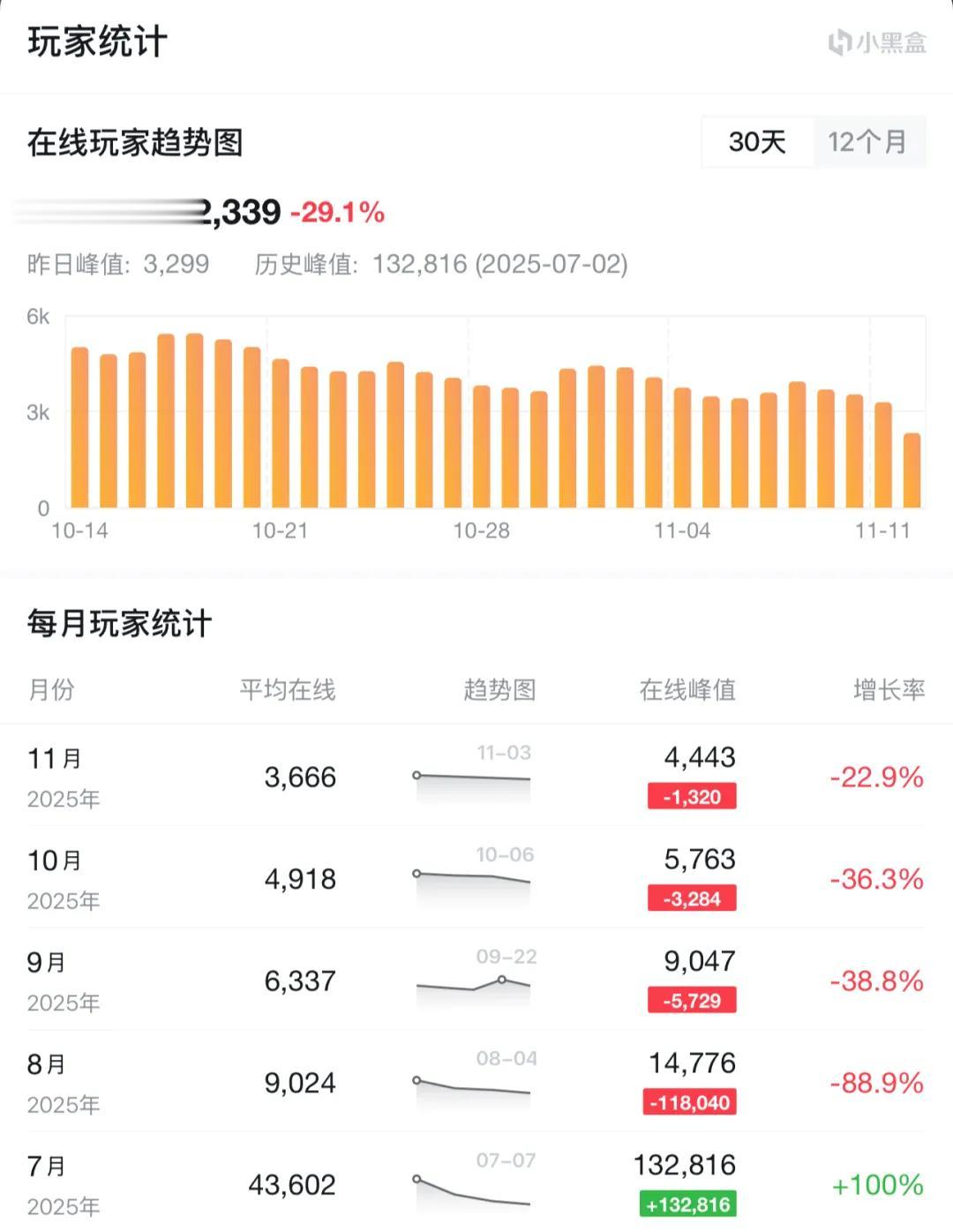《解限机》在7月2日登陆Steam,上线首日的在线人数达到13.28万。不过,三天后,该数字下降到7万。根据小黑盒的数据,第二个月的峰值在线人数减少了近九成,只剩下1.47万。运营到现在,在线峰值已经低于5000人。