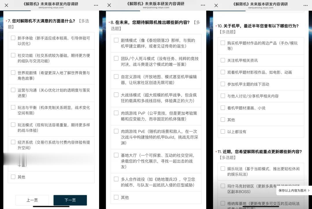在公开信中,郭炜炜称团队意识到,光靠界面、匹配和数值优化,并不能把玩家留住。那么玩家希望看到什么?信件列举了多个方向,比如大规模PVE、合作挑战、自定义机兵、甚至完整的机甲剧情,但团队并未直接宣布做哪一个,而是希望跟玩家进行更深度的沟通调研来确定。为此,他们上线了一份名为“梦想中的机甲游戏”问卷,将持续四周。团队表示,这次的反馈会直接影响接下来的制作。