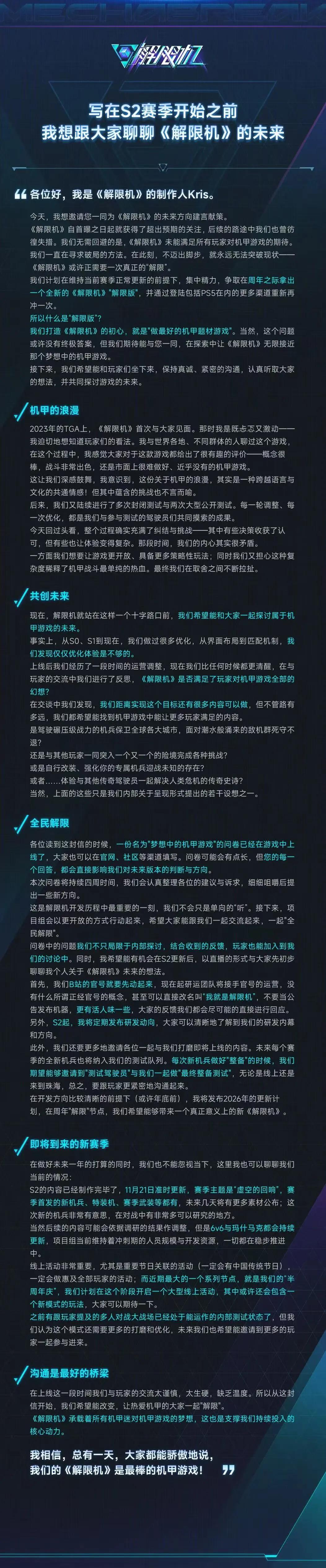 刚刚,《解限机》制作人Kris(郭炜炜)发布了一封面向玩家的公开信,并开始收集未来版本的意见。从信件内容来看,团队希望正