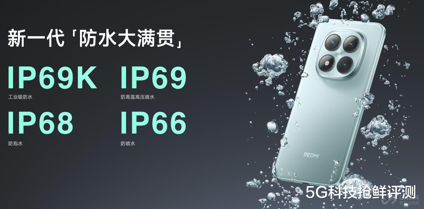REDMI Note 15 Pro+ 支持 IP66 & IP68 & IP69 & IP69K 防水大满贯,并通过行业首个南德「五星长效防水品质认证」,可轻松抵御日常淋雨,意外浸泡、落水,甚至热水喷淋、高压喷水都能应对自如。