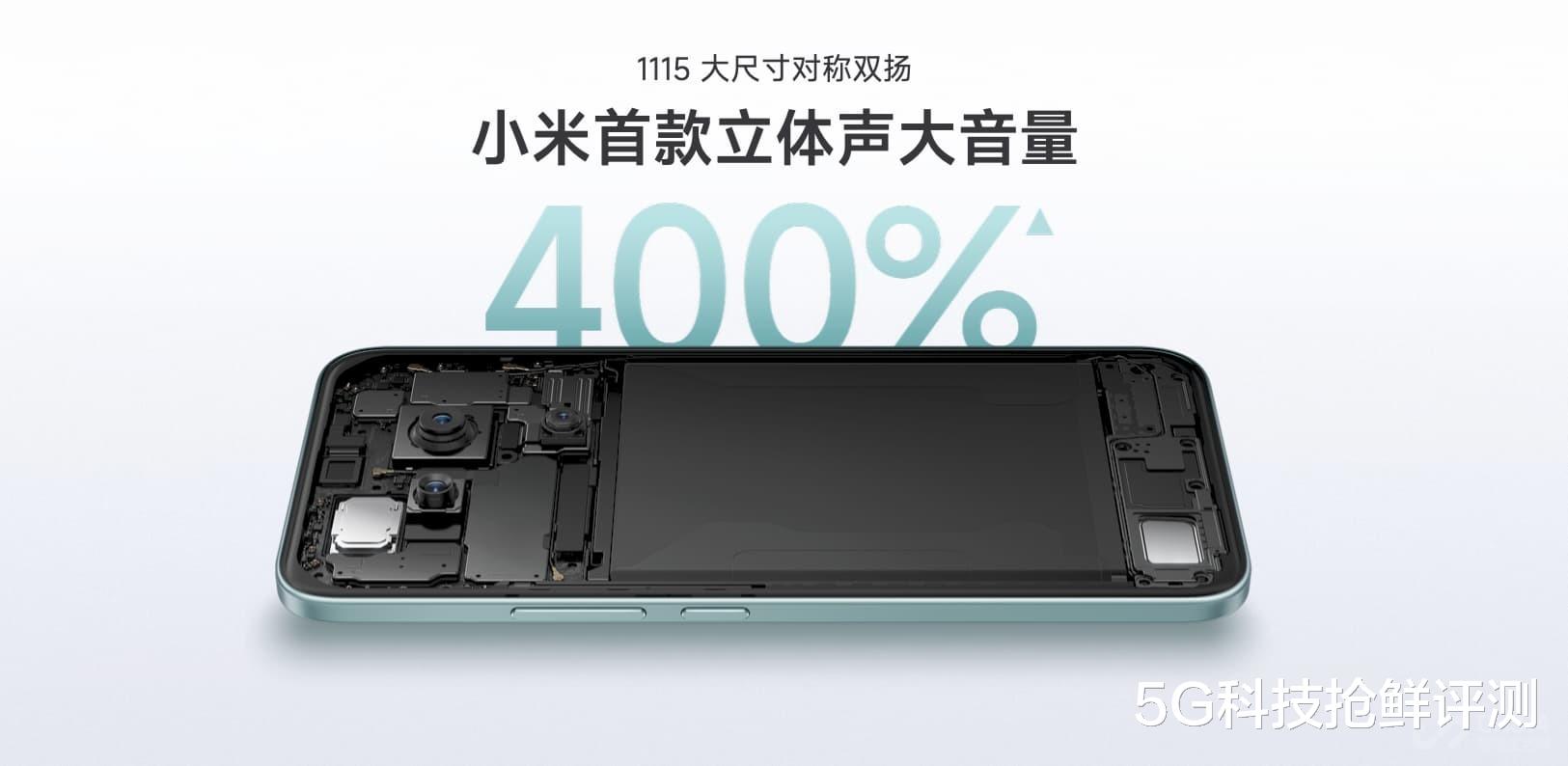 采用同档更强的 1115*2 对称立体双扬声器,真对称立体声设计,声场分布均匀。支持 400% 大音量,可覆盖外放全场景(小爱同学和闹钟除外),用户在音乐、视频和通知等场景体验更佳,尤其 400% 铃声通知更照顾老年群体使用。同时支持高亮手电筒功能,可使用相机闪光灯照明,亮度对比上代提升 2 倍。