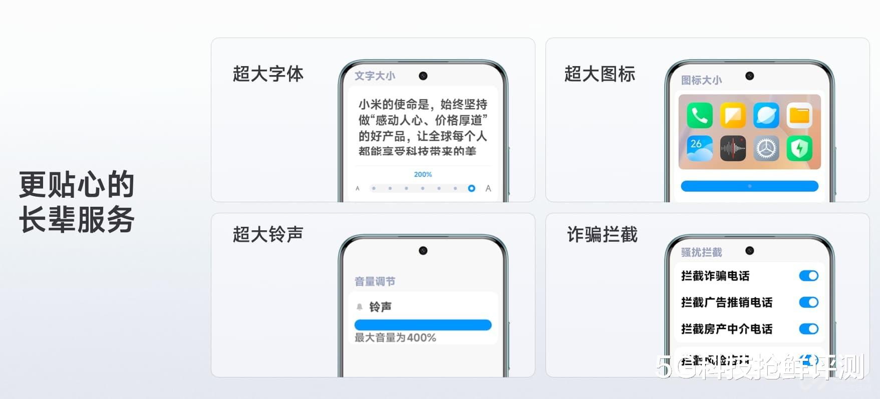 专为老年人群设计「长辈关怀」功能,支持对字体大小(最大可调至 200%)、图标大小(可调大约 10%)、铃声音量(最大可调 400% 大音量)、拦截诈骗电话,拦截广告推销电话、拦截房产中介电话、拦截风险应用的调节,一站式调节适老功能,让老人能看得清、听得见、不被骗。