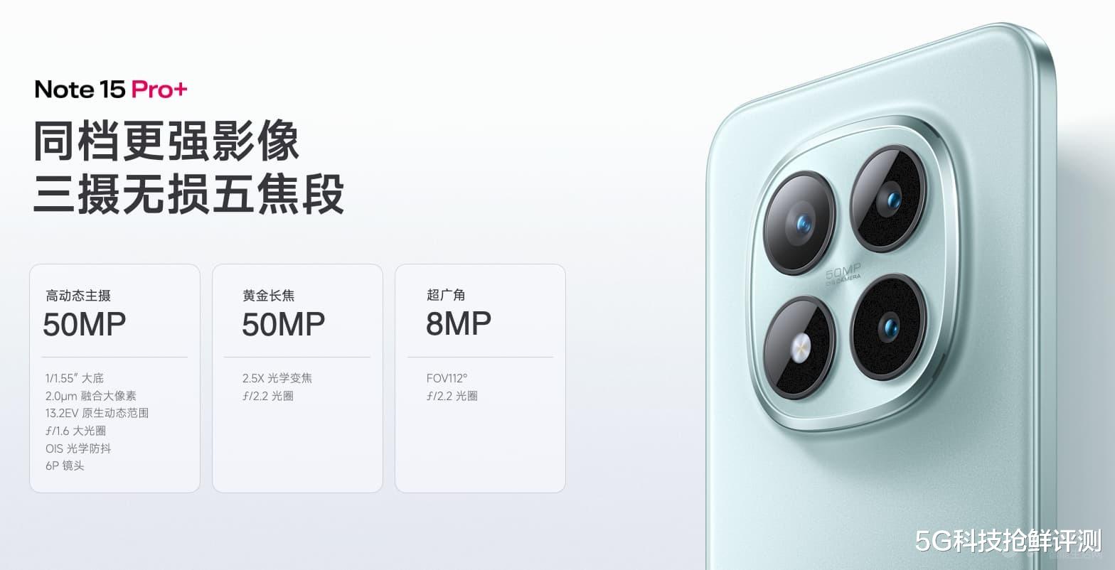 REDMI Note 15 Pro+ 搭载旗舰同款「光影猎人800」主摄,1/1.55" 大底,支持 OIS 防抖,具有超高静态画质、超高视频能力、原生HDR 等能力。支持双原生 ISO Fusion Max,画面动态范围可达 13.2EV,可以说是同级最强主摄。