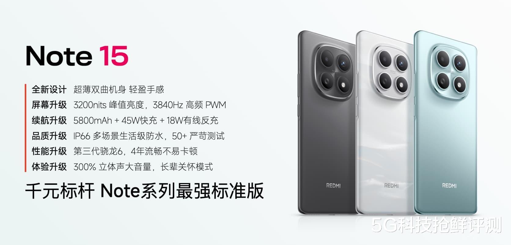 REDMI Note 15 定位千元标杆,Note系列最强标准版。外观采用同档唯一双曲设计,178g重、7.35mm厚,手感轻盈,握持舒适。屏幕升级 6.77" 3200nits超级阳光屏,支持3840Hz 高频PWM + DC调光。续航升级 5800mAh + 45W快充 + 18W有线反充。同时支持IP66多场景生活级防水和湿手触控2.0,通过1.7米花岗岩极限面跌测试、50多项品质测试,获得 CQC 严苛环境卓越品质认证。配备300%立体声大音量和长辈关怀模式,更适合老年群体,是目前千元机中最值的购买的新品。