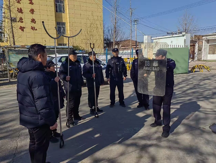 培训中,民警结合校园突发事件典型案例,细致讲解应急处置基本原则、“早发现、早报告、早处置”工作流程及相关安全法律法规,让参训人员清晰掌握突发事件先期处置核心要点;实战演练环节,民警手把手指导参训人员操作防暴盾牌、钢叉等防护器械,演示攻防技巧与小组战术配合要领,模拟“可疑人员闯入校园”场景开展协同处置演练,确保参训人员在紧急情况下能“拉得出、顶得上、处置快”。