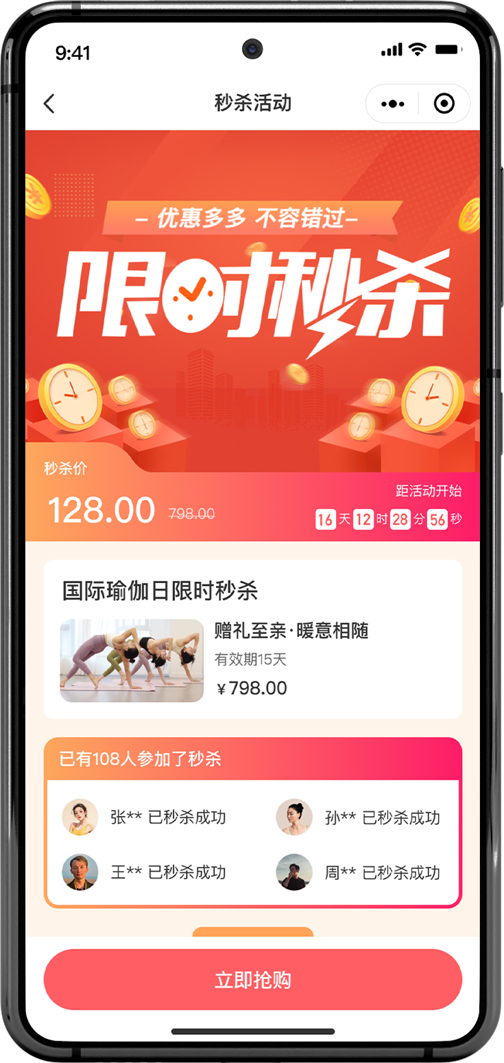 限时情感营销:结合国际瑜伽日节点,以 “送家人” 为情感切入点,通过菲特云限时秒杀营造紧迫感,激发用户为家人送上健康关怀。