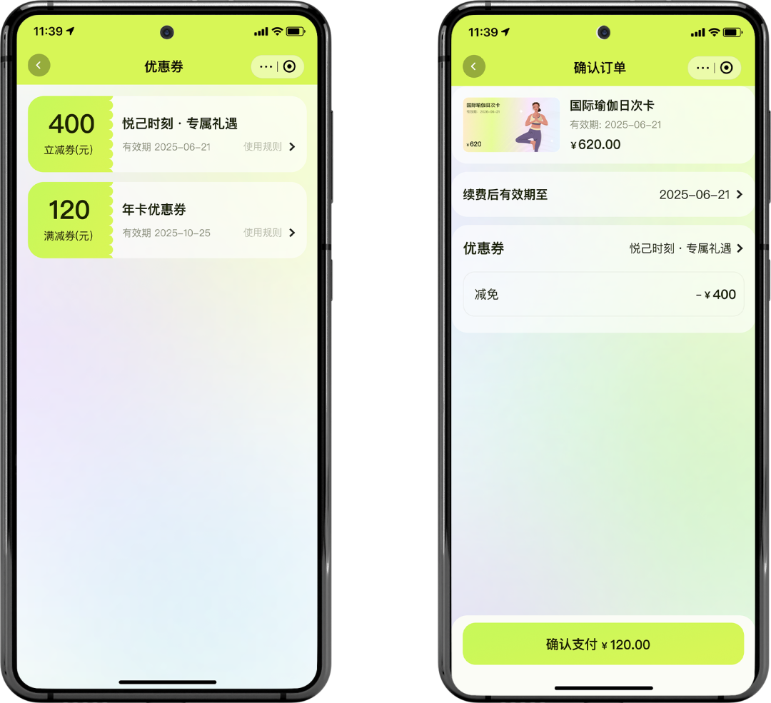 120元「悦己时刻・专属礼遇」单人券(原价620 元,仅限前100名):含 1 节私教定制课(肩颈修复 / 能量冥想任选)+1 次身体评估,为自己定制专属瑜伽时光,在体式舒展中倾听内心声音。