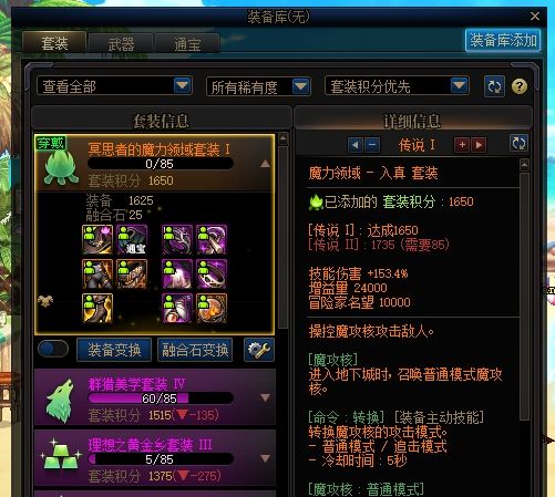 我们每天在刷完深渊之后,会把自己背包里的装备添加到装备库,就像我如上的操作这样,添加到装备库之后,你的装备库里就会有很多个套装,而且他们会显示自己当前的总积分量,积分就是115版本已累积套装装备的分数,我们可以把它比作之前版本的喂养,喂养的越高,套装也就越强,而现在是套装的总积分越高,套装的能力也就越强。