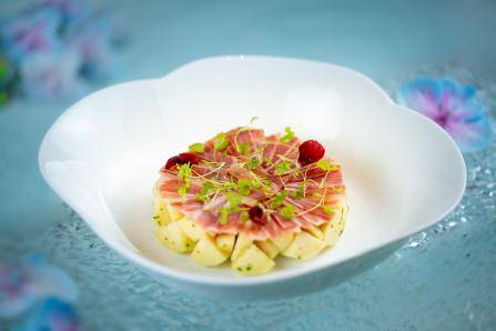 江南的冬意,藏在风物里。冷碟以浙江本土食材为纸,时间为笔:火腿丝拌冬笋取富阳黄泥冬笋配金华火腿丝,清鲜与咸香交织;东山坞素烧鹅以富阳“山毛豆”豆腐皮施广式烧鹅手法,素中有味;龙吟阁金钱腿用舟山鱼露与元红酒浸渍猪前小腿,咸鲜透酒韵;生腌舟山花虾以潮汕古法腌渍,虾肉晶莹,鲜甜中见咸鲜。