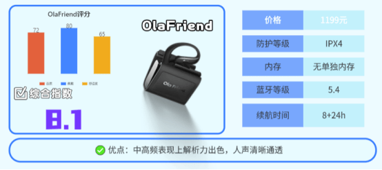 在声音表现上,OlaFriend 采用双发声单元结构,并配合空间音频算法进行调校,即使在不封闭耳道的情况下,也能营造出开阔且具层次感的声场。中高频清晰细腻,人声位置自然靠前,收听播客、有声读物或轻音乐时尤为舒适。同时内置的风噪抑制技术在骑行、跑步等户外场景下表现稳定,有效削弱气流干扰,确保声音输出始终清楚顺畅,整体听感更加从容可靠。