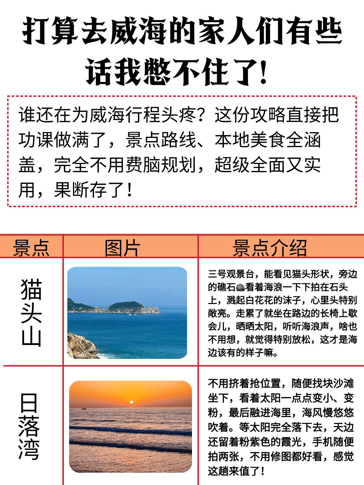 谁还在为威海行程头疼?这份攻略直接把功课做满了,景点路线、本地美食全涵盖,完全不用费脑规划,超级全面又实用,果断存了!