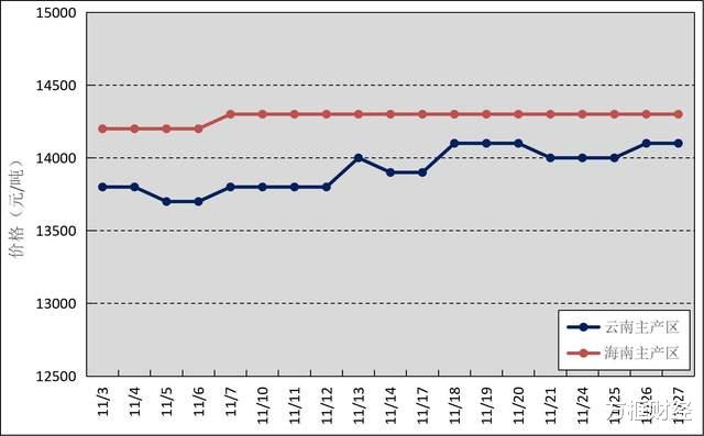 国内主产区:11月,云南产区生产较为稳定,原料正常释放,海南产区天气状况改善,原料价格波动不大。云南、海南鲜胶乳(折干胶)月均价格分别为13921元/吨、14279元/吨,环比分别上涨98元/吨、526元/吨。