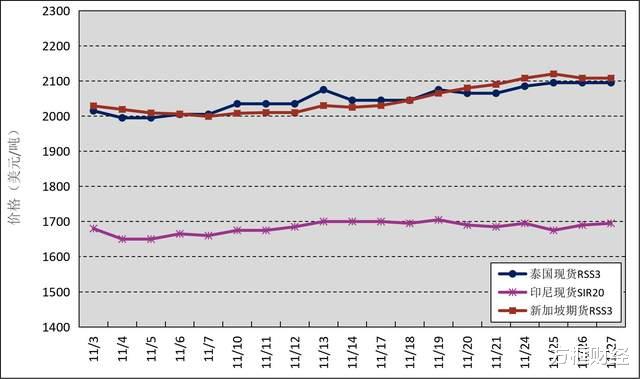 国外主产区:11月,泰国RSS3平均价格2048美元/吨,环比上涨6美元/吨,最高价2095美元/吨,最低价1995美元/吨;印尼SIR20平均价格1683美元/吨,环比下跌9美元/吨,最高价1705美元/吨,最低价1650美元/吨;新加坡RSS3期货主力合约月均结算价格2047美元/吨,环比上涨26美元/吨,最高价2120美元/吨,最低价1999美元/吨。