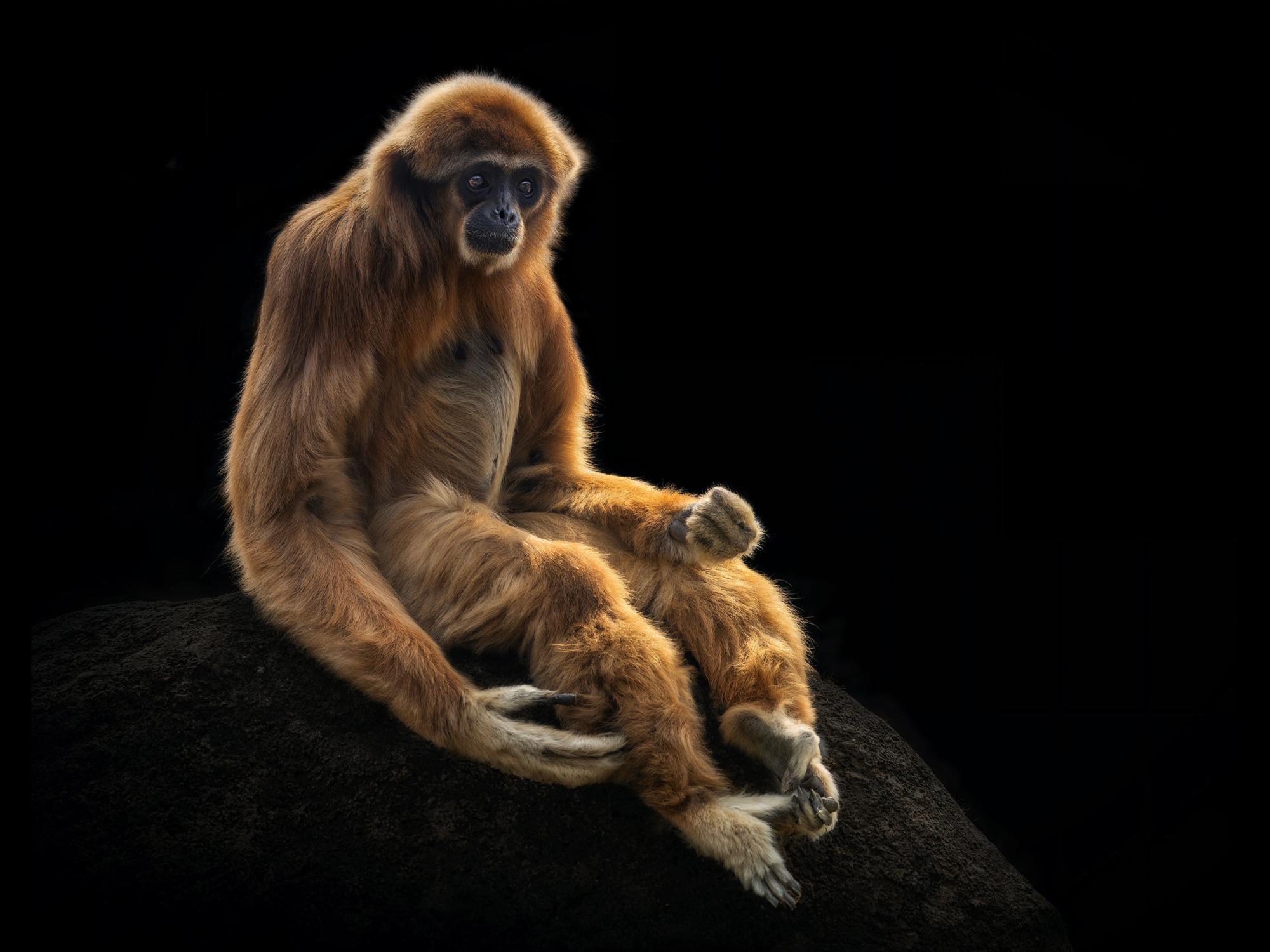 这只长臂猿目光专注,静静地坐着沉思。它专注的表情透露出其深邃的智慧,以及这种迷人的灵长类动物所特有的好奇心。