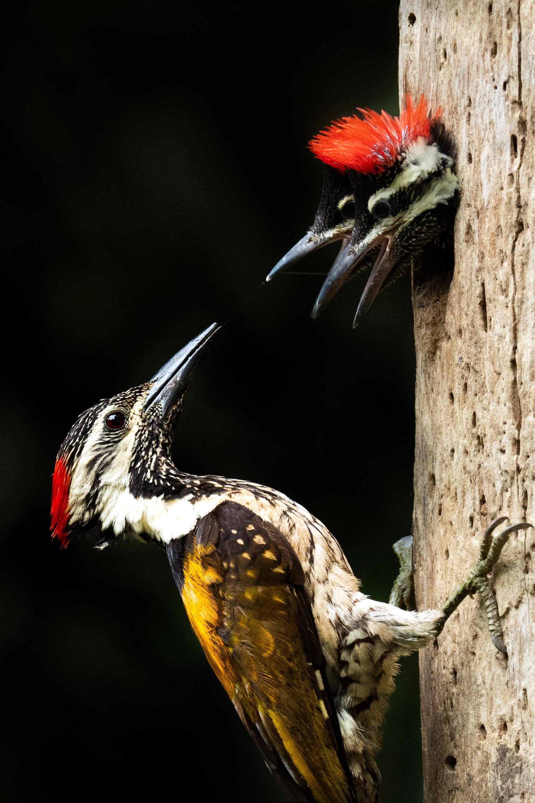 一只啄木鸟妈妈栖息在树枝上,正在喂食从树干空洞中探出头来的小啄木鸟。这张照片拍摄于孟加拉国的乔伊普哈特,捕捉到了野外父母与孩子之间温馨的亲子关系。