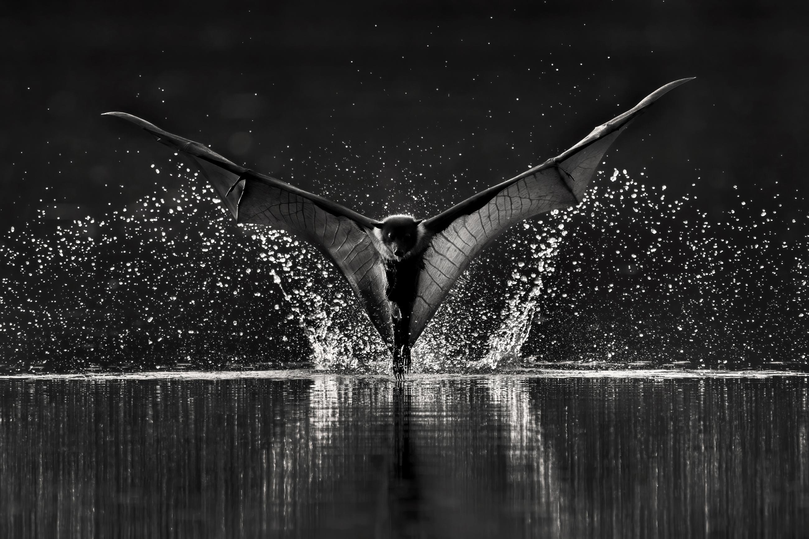 这张印度飞狐浸入水中的照片拍摄于夏季,当时气温超过45摄氏度。