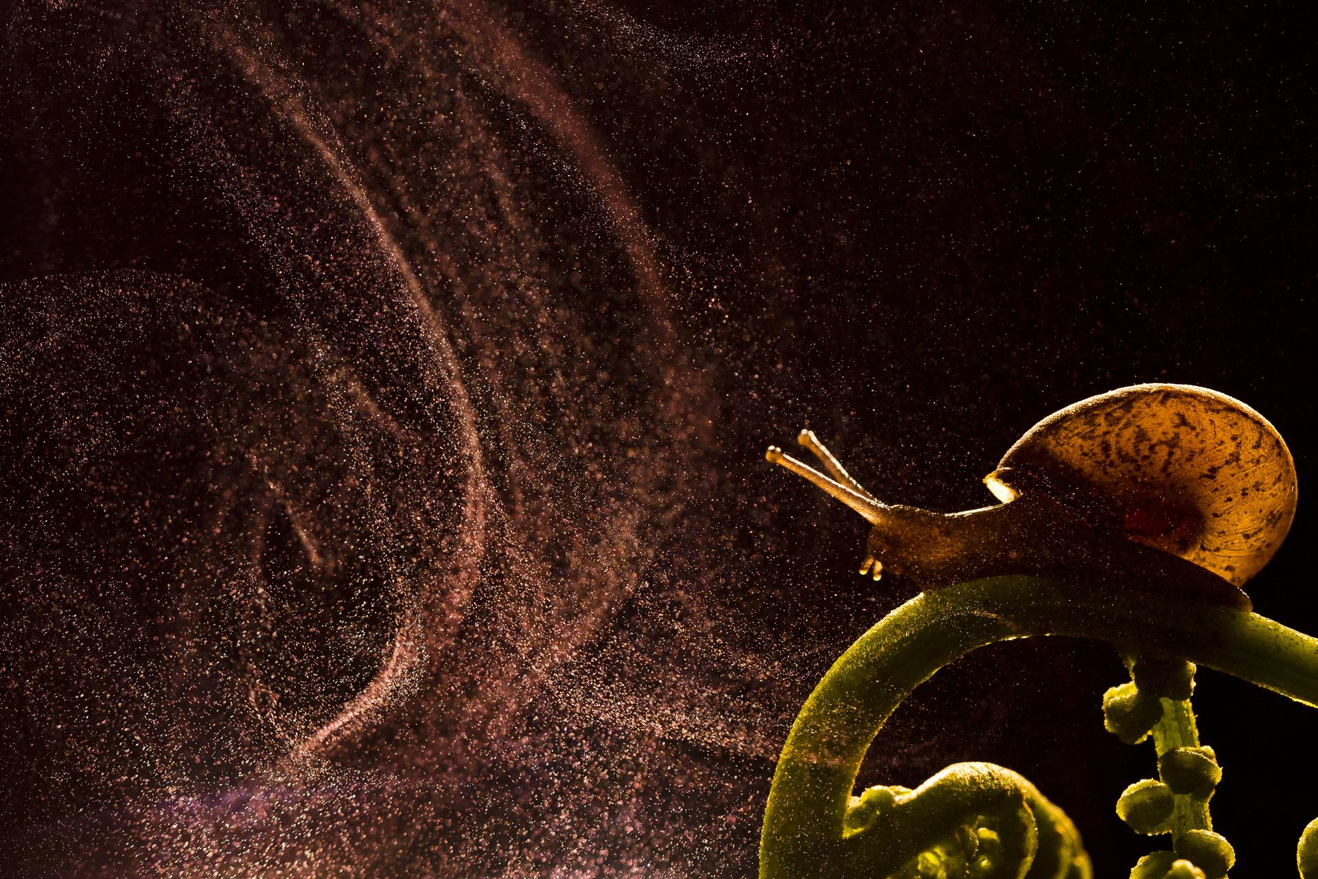 一只蜗牛在雨季享受着由伞菌释放的孢子。摄影师预先规划了这张照片,等待所有元素完美融合的那一刻。
