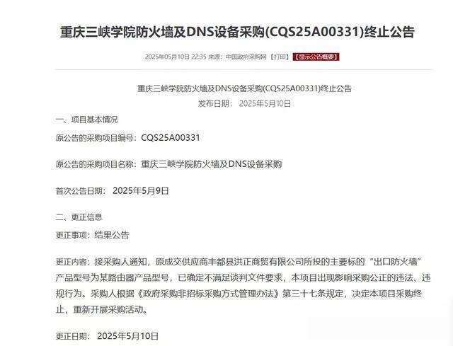 有记者发现,5月10日晚10时许,中国政府采购网发布了一则《重庆三峡学院防火墙及DNS设备采购(CQS25A00331)终止公告》,更正信息一栏中显示:“接采购人通知,原成交供应商丰都县洪正商贸有限公司所投的主要标的‘出口防火墙’产品型号为某路由器产品型号,已确定不满足谈判文件要求,本项目出现影响采购公正的违法、违规行为。