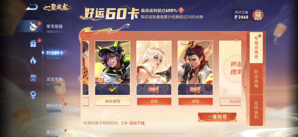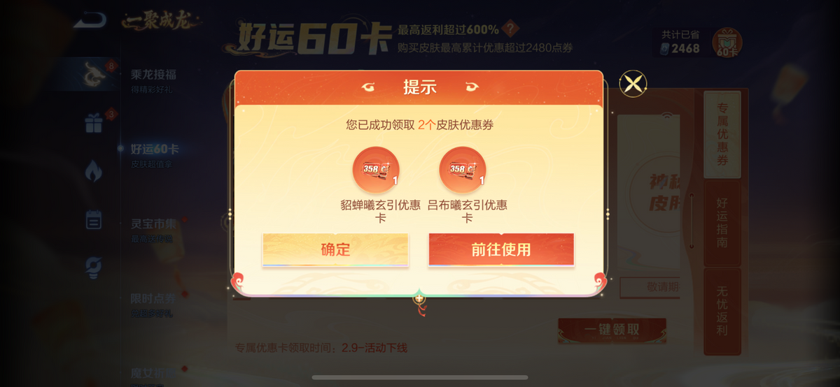 另外王者荣耀龙年好运60卡优惠皮肤包括此次2024情人节限定皮肤的专属优惠,购买龙年好运60卡的玩家,还可以领取价值358点券的皮肤超值专属优惠券。