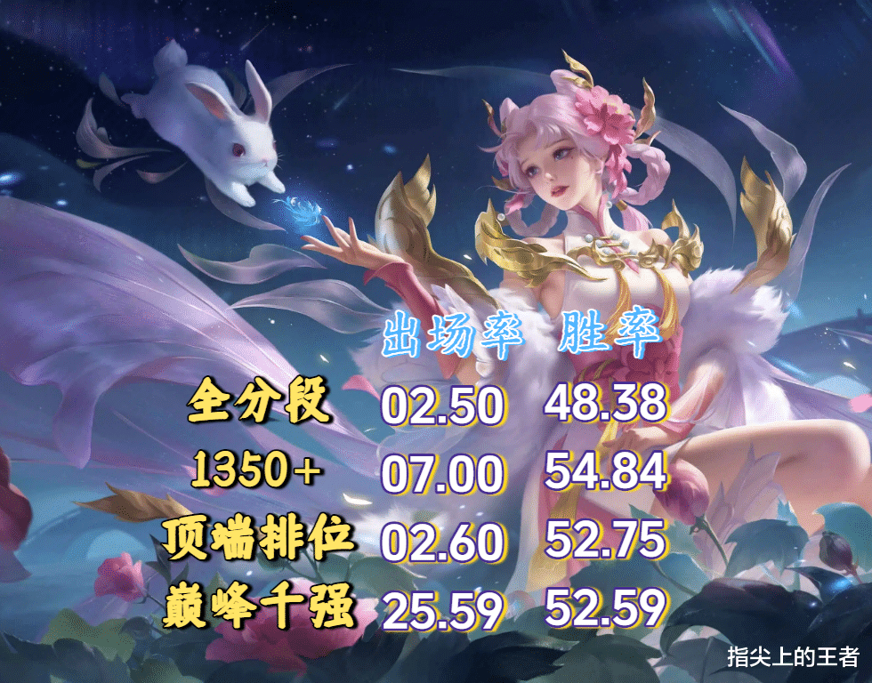 目前嫦娥在巅峰赛千强中的出场率25%以上,胜率快要接近53%了,这还是上赛季削弱的结果,所以很多人说嫦娥那一刀似乎并不会动到根本,看到这个出场率,看到和这个胜率,我也是能理解了。