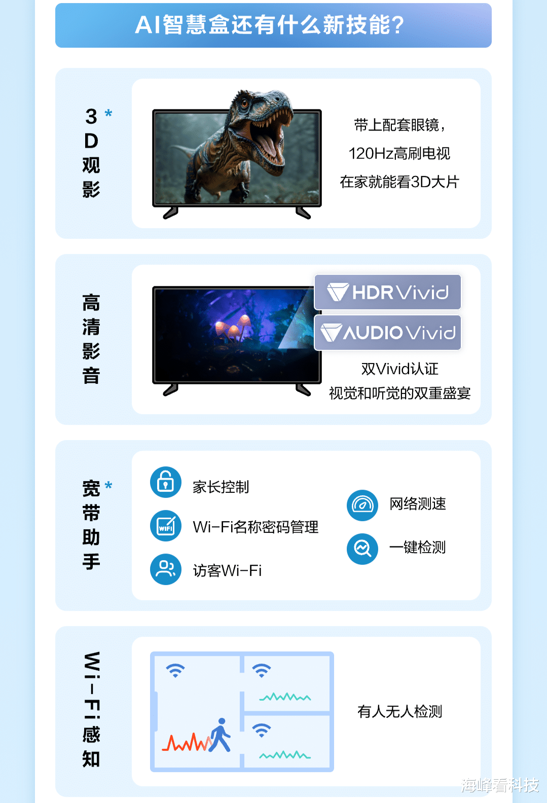 其次,沉浸式视听与娱乐体验的升级,让家庭成为高品质娱乐空间。据现场工作人员介绍,AI智慧盒支持4K@60fps超高清解码,搭配HDR Vivid与Audio Vivid双认证技术,可让电视画面亮度较传统SDR提升40倍,色域提升70%,色彩鲜活逼真;360°环绕立体声让声音具备高度与方向感,带来可交互的沉浸式听觉体验。