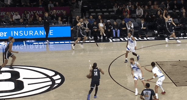 上线和夏普的手递手配合,行进间在弱侧底角马卡回收的一瞬间立即传给底角的沃尔夫,然后欣赏一下沃尔夫丝滑的接球虚晃后迅速向右刺探调度马卡防守重心,随即衔接左路突破后的转身勾手。