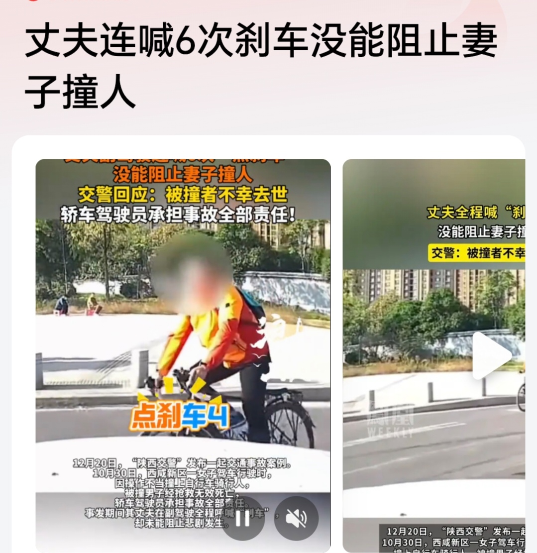 当时骑车的男子出现在两个人视野中时,坐在副驾驶上的丈夫大声提醒司机妻子“点刹车”,妻子还是没有做出正确的选择。