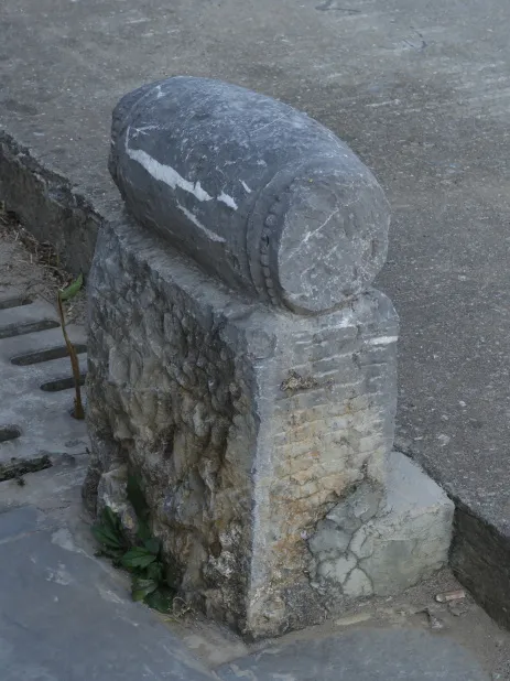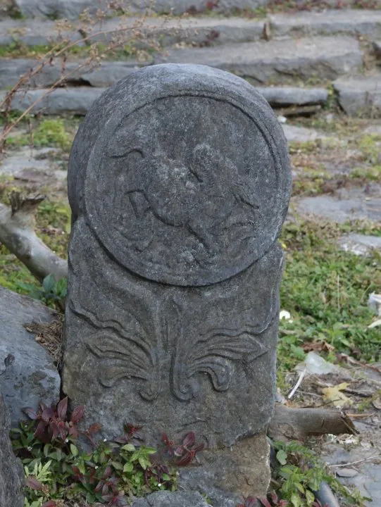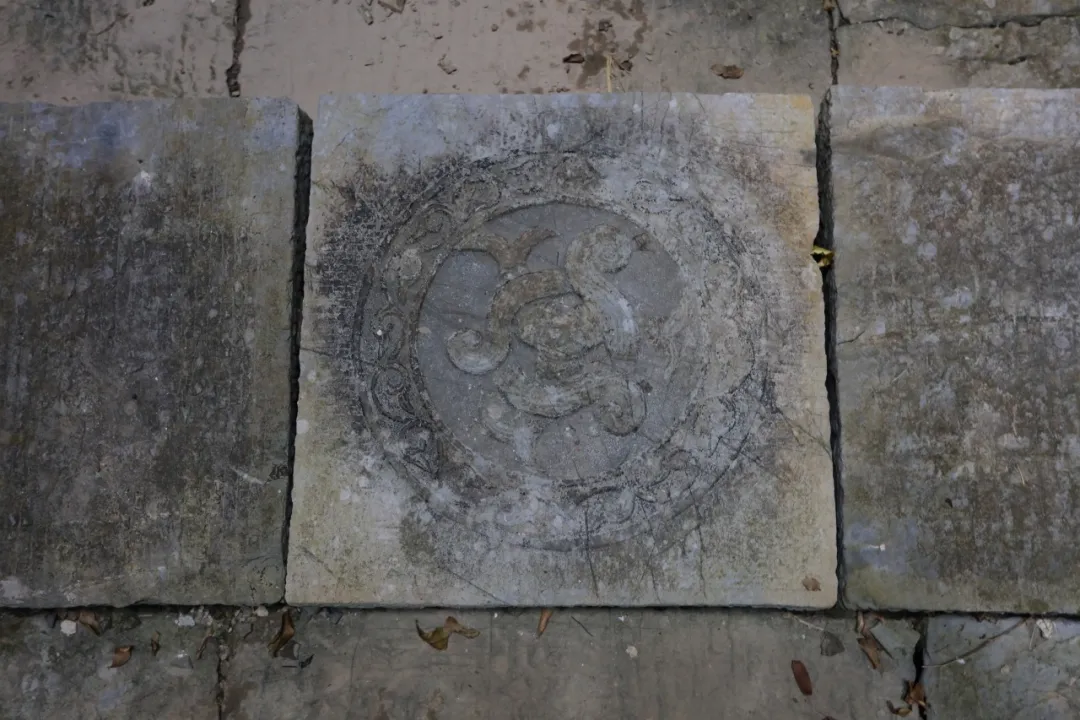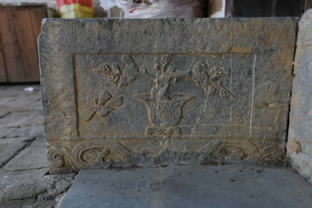 例如右厅屋大门前的一方抱鼓石,上方雕刻出石鼓形状,下方为方形石座,两面雕刻上草木图案,寓意吉祥。再如右厅屋门前的门墩石,上刻喜鹊登梢图,寓意喜上眉梢。尤其是一块置于天井中的方石尤为特别,上面刻有三鱼共首图,四周饰有波浪图案。