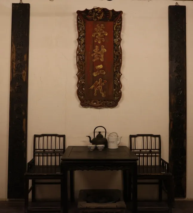 厅屋建筑以祠堂为轴心,向四周有序延伸,祠堂内部分为下厅、中厅与上厅,配以两天井,三厅相互贯通。