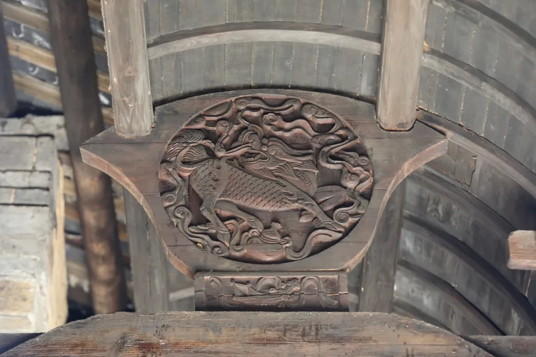 三鱼共首图流传于东汉画像石中,含义丰富,一说它代表万物生命的繁衍,二说它作为天界神物寓意祥瑞富贵,三说其寓意阴阳对立统一。设计者将其置于天井之中,实在巧妙。