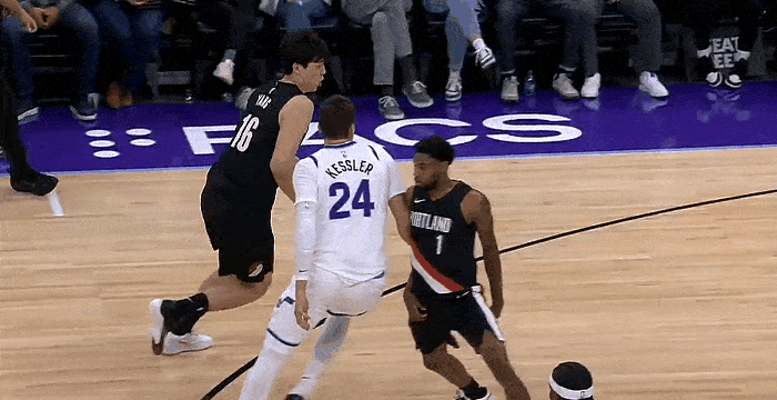 NBA季前赛,爵士对阵开拓者的比赛正在进行中。第一节比赛中,杨瀚森左手持球突破打板得手,可惜撞倒乔治被吹进攻犯规。