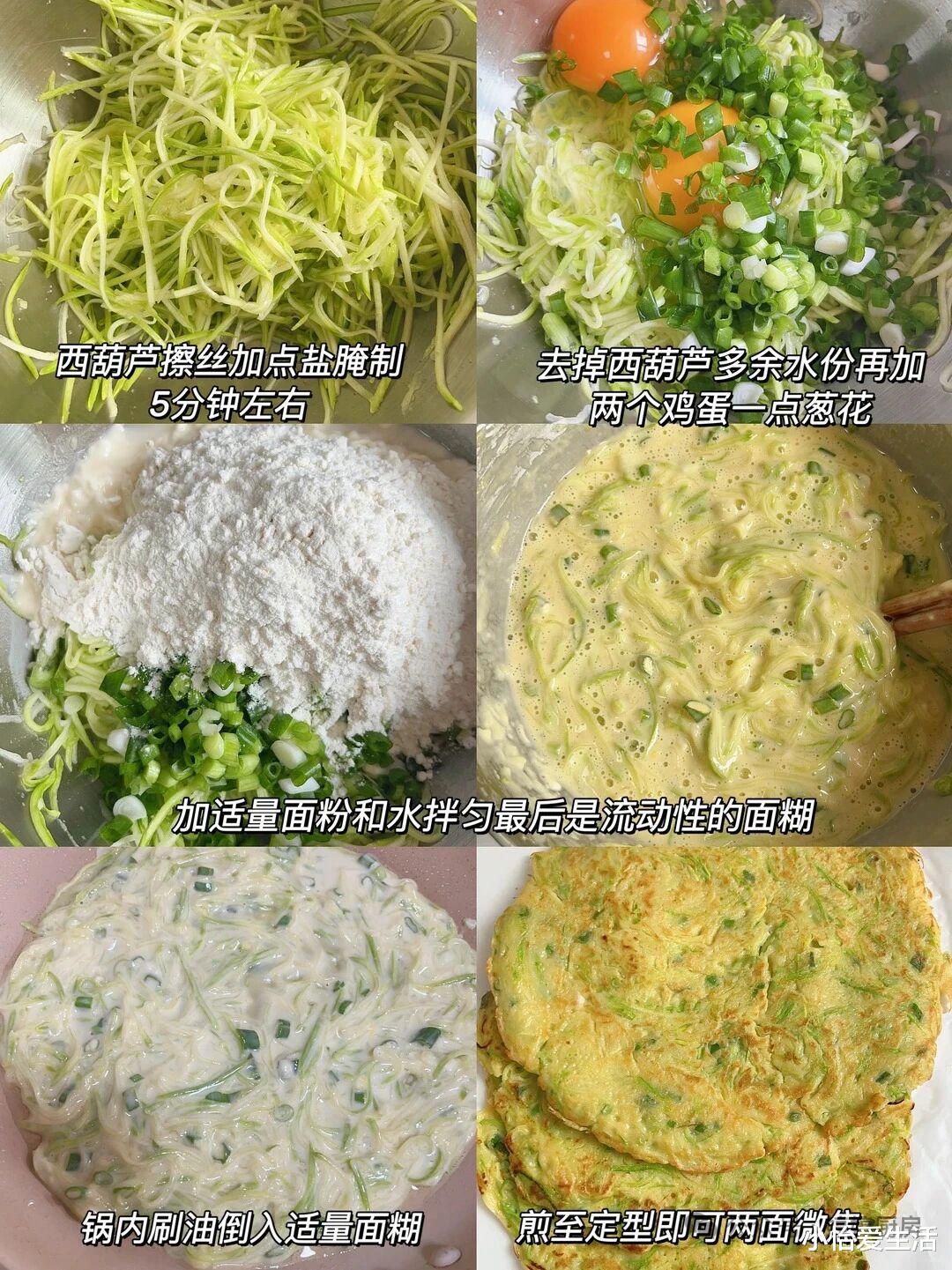 1. 西葫芦切薄片,用盐抓匀静置5分钟,挤干水分。