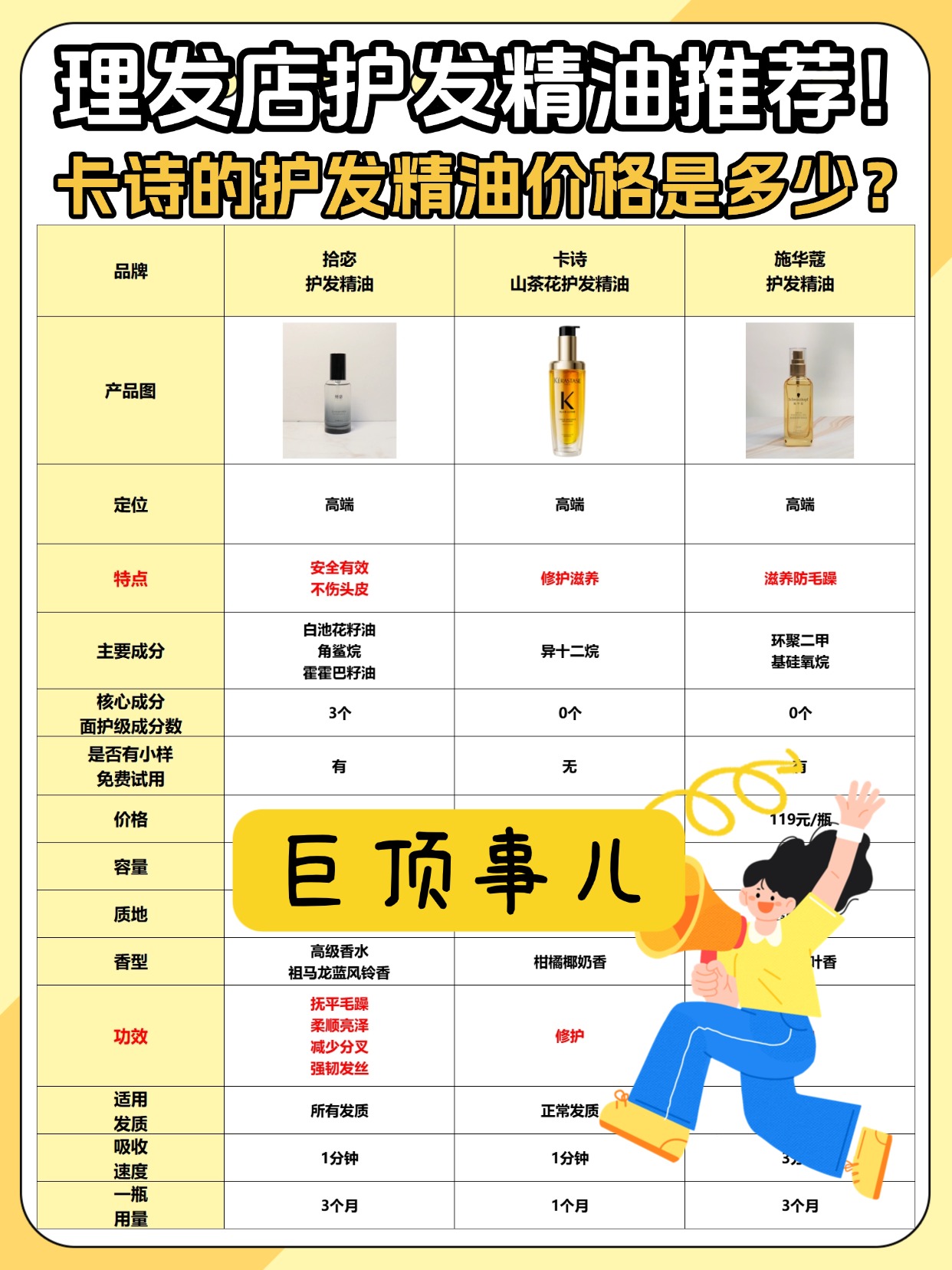 最近被问爆卡诗的护发精油价格是多少,其实比起价格,我更想跟大家聊聊护发精油有必要买贵的吗,还有很多油头姐妹关心的护发精油会不会让头发变油这两个问题!先说说价格,市面上护发精油价格跨度挺大的,卡诗这类品牌的单品价格大概在几百块,而平价款几十块也能买到。但贵的不一定就适合自己,之前我测过不同价位的精油,发现很多平价款的清爽度和滋润度完全不输贵价的。再说说油头姐妹担心的油腻问题,其实只要选对质地和用法,就不会让头发变油。选的时候优先选流动性强、标注清爽型的,用法上一定要注意,只涂发尾,别碰发根,用量控制在1-2泵,涂完后用手抓匀,这样就能有效防毛躁又不会显得头发油腻。很多姐妹觉得贵的就不会油,其实不然,关键还是看产品配方和自己的使用方式。下面是我总结的一些护发精油选购注意事项,不管是选贵价还是平价都能用得上,干货满满,建议先收藏哦!
