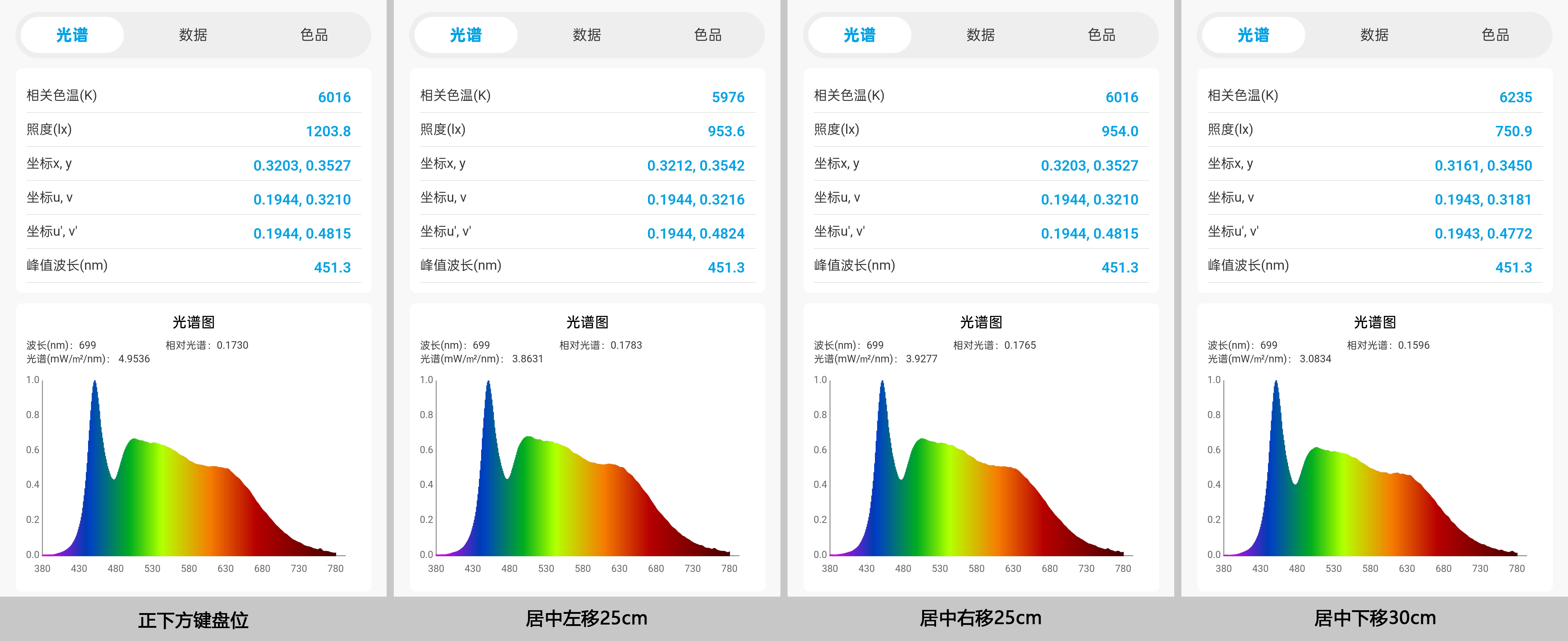 在挂灯正下方的键盘位置,照度值为1203lx,相关色温值为6016K。从这个正下方位置向左平移25cm后,照度值为953lx;而在右侧对称位置,即右移25cm处,照度值为954lx。若从正下方位置垂直向下移动30cm,照度值变为750lx。