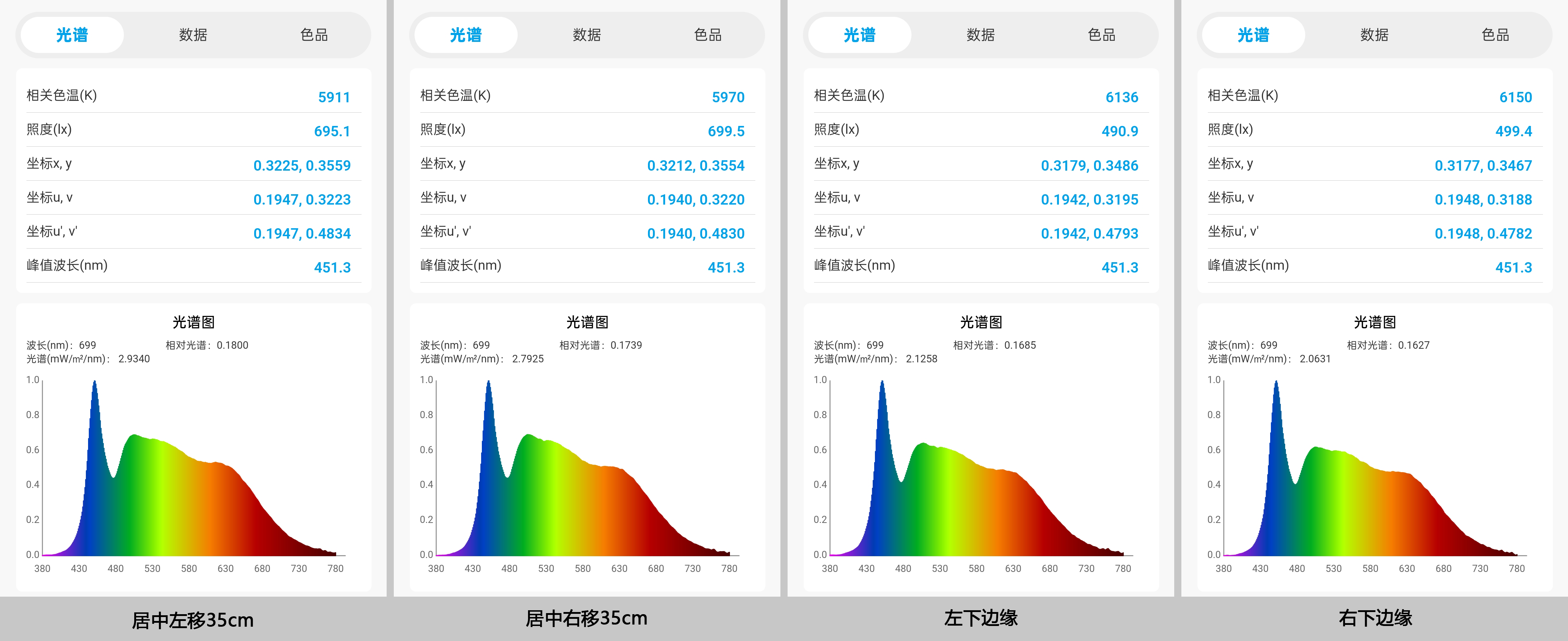 同样以正下方居中位置为参考点,当向左平移35cm时,照度值降至695lx;相应地,向右平移35cm,照度值为699lx。最后,将照度仪分别放置在左下角和右下角位置进行测量,左下角的照度值为490lx,右下角为499lx。