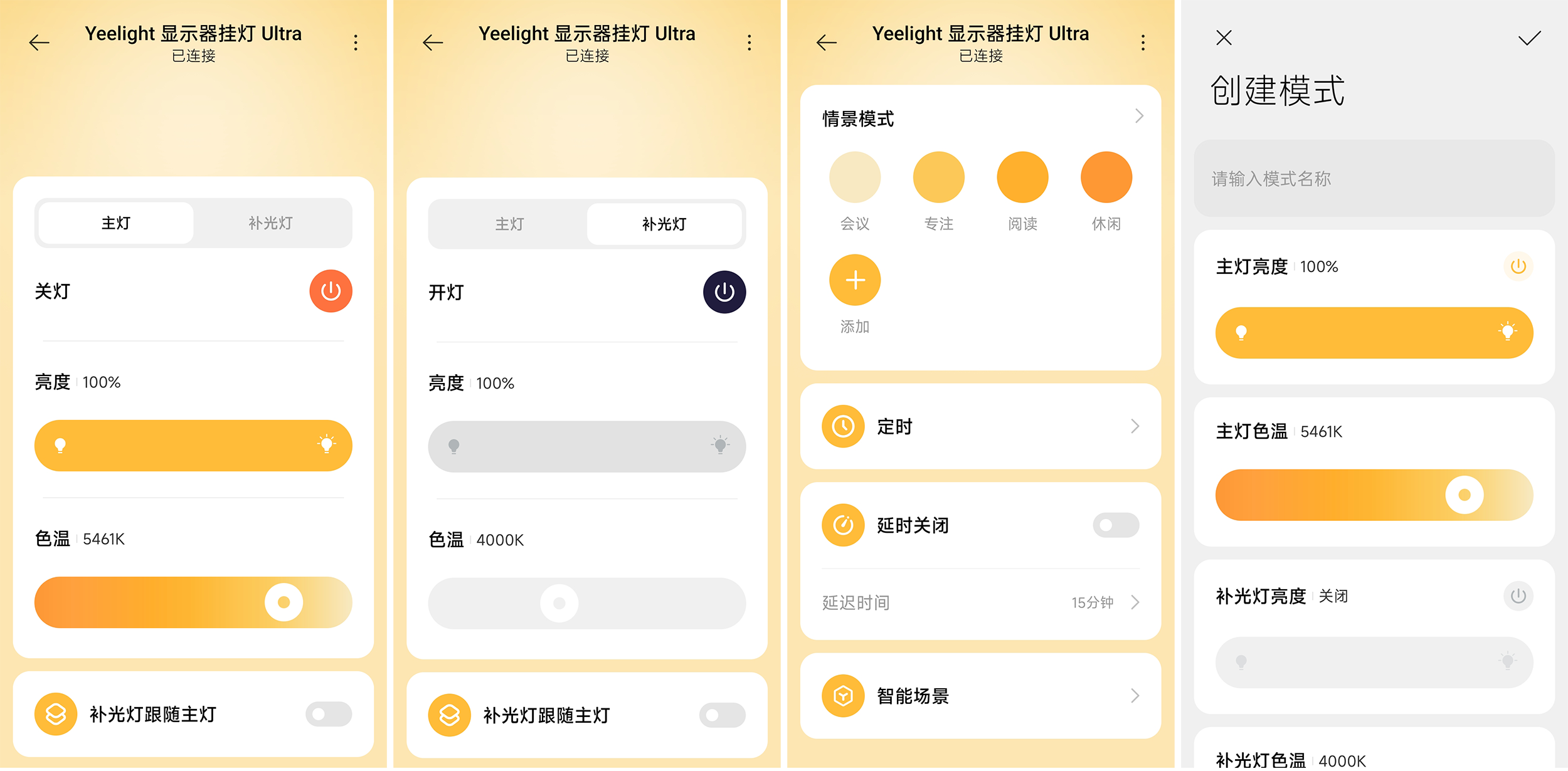 值得一提的是,Yeelight显示器挂灯Ultra还支持米家生态接入。我们不仅能借助米家APP或小爱同学调节亮度、色温以及设置定时开关,还能通过智能场景设置,与其他支持的米家产品实现联动,拓展出更多玩法。