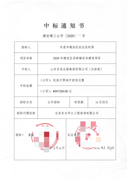 2020年8月,经公开招标(招标代理:北京东方华太工程咨询有限公司),山东百花成功中标2020年建安区苏桥镇农田建设项目五标段,随后与招标人许昌市建安区农业农村单位在建安区兴业大厦三楼签订生物有机肥采购合同。根据中标通知书及合同约定,项目中标价90.72万元,供货期15日历天,需供应规格为40公斤/袋的生物有机肥16200袋(合计648吨),产品需符合国家NY884-2012生产标准,具体技术参数为圆颗粒状、有机质≥50%、活性菌含量≥3亿/g,且各项指标需高于最低标准。