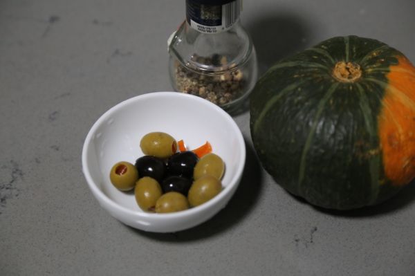 贝贝南瓜 半个 、 西班牙黑橄榄 4颗 、 西班牙绿橄榄 6颗 、 淡奶油 20毫升 、 牛奶 100毫升 、 盐 少许 、 黑胡椒粉 少许