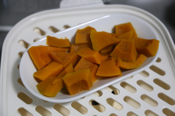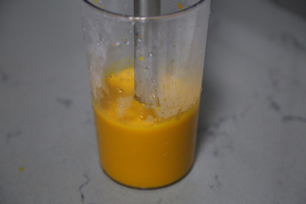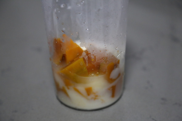 将蒸好的南瓜放入料理棒杯,加入牛奶和淡奶油