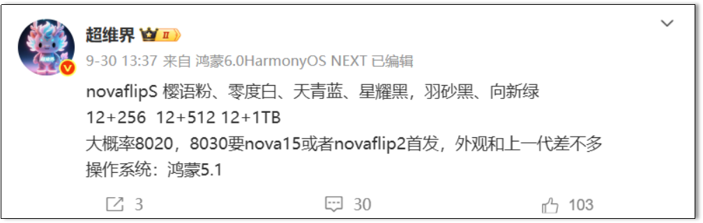 “nova flip S 樱语粉、零度白、天青蓝、星耀黑,羽砂黑、向新绿,12+256 12+512 12+1TB。大概率8020,8030要nova15或者novaflip2首发,外观和上一代差不多 。操作系统:鸿蒙5.1”