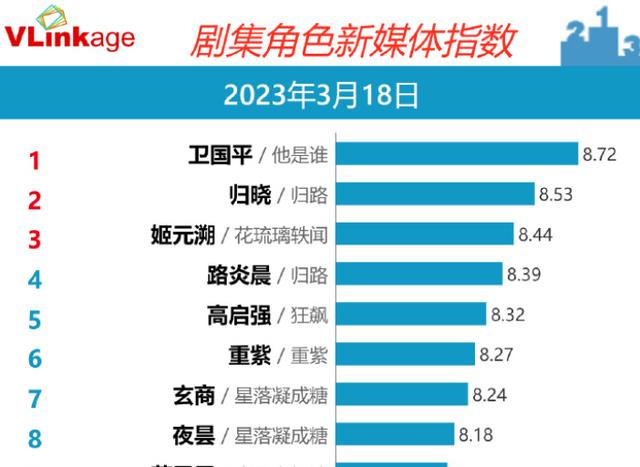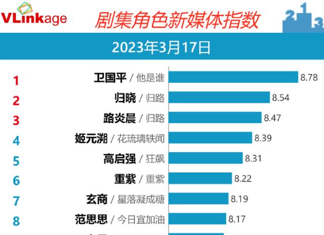 剧集角色新媒体指数:卫国平、归晓排名稳定,姬元溯超越了路炎晨!不知道哪一个角色是让你念念不忘的,可以在评论区写下来。