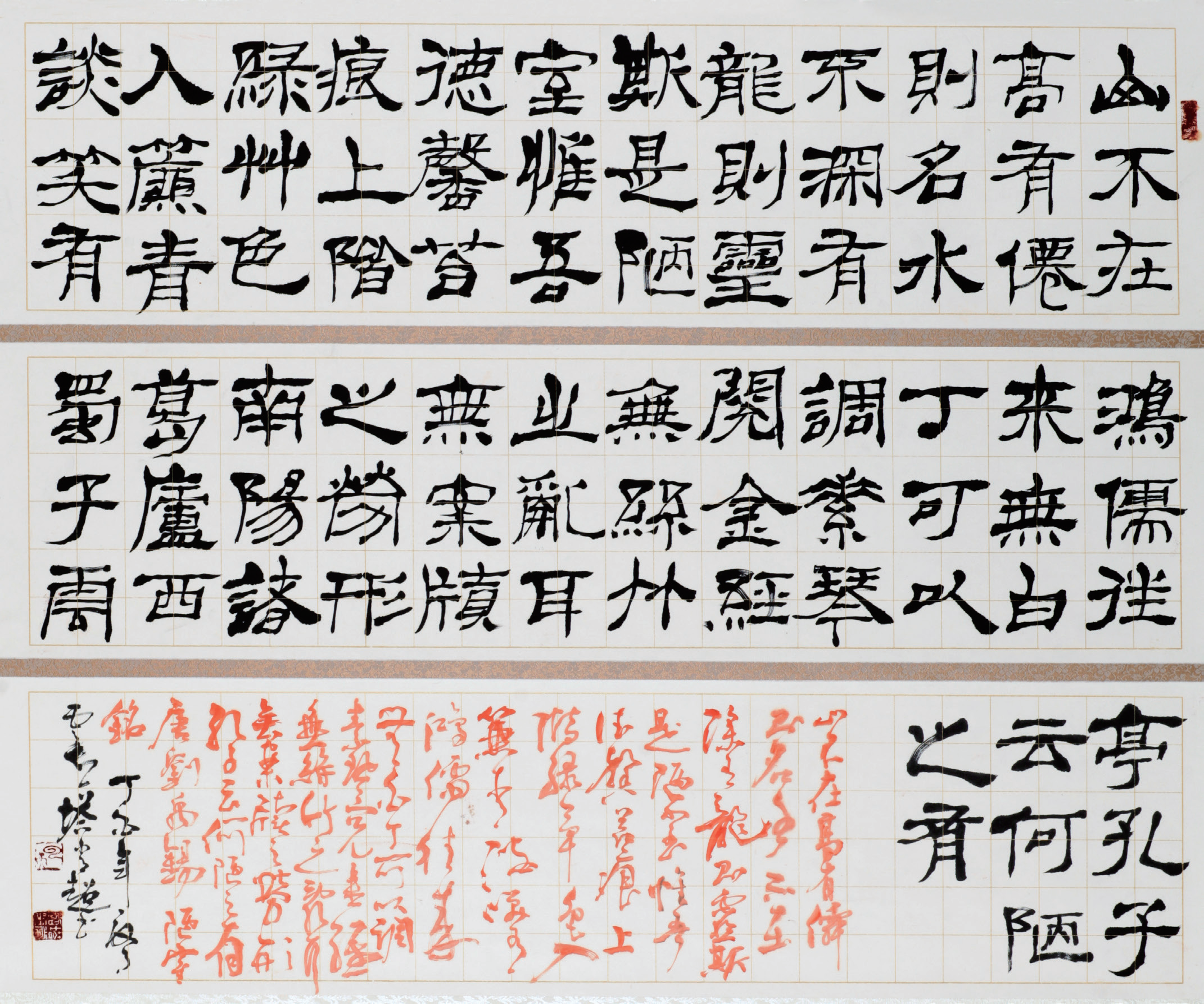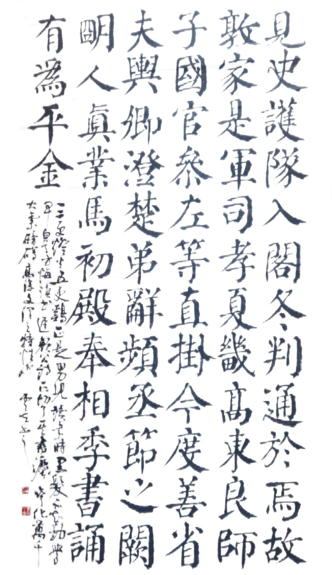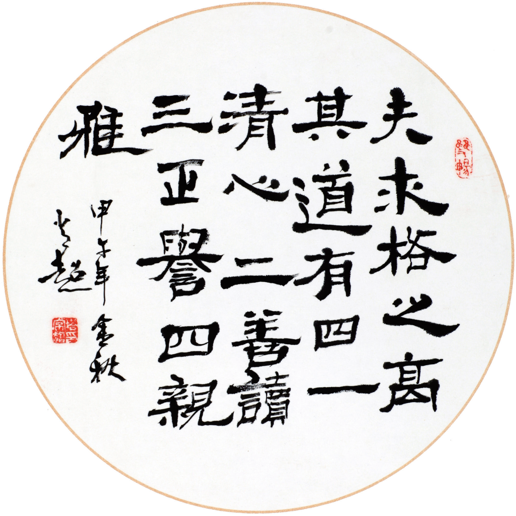 常超从幼年起,便把传统书学作为自己的主攻方向,从临摹入手,掌握各种书体的特点,积之有年。他的学习是多方面的。在楷书方面,他喜欢颜真卿的浑朴厚重,下了很深的功夫。他临《颜勤礼碑》和《麻姑仙坛记》《自书告身》等等。多年的临习,颜体楷书成为他书法的立根之基。而常超的隶书紧紧把握住《礼器》《史晨》及《乙瑛》等等的东汉名碑,亦在《张迁》《衡方》这种方整朴茂的隶书上深下功夫,更潜心研究将这些历史名碑融汇贯通,集其所长,形成自己典雅、雄厚的隶书风格。