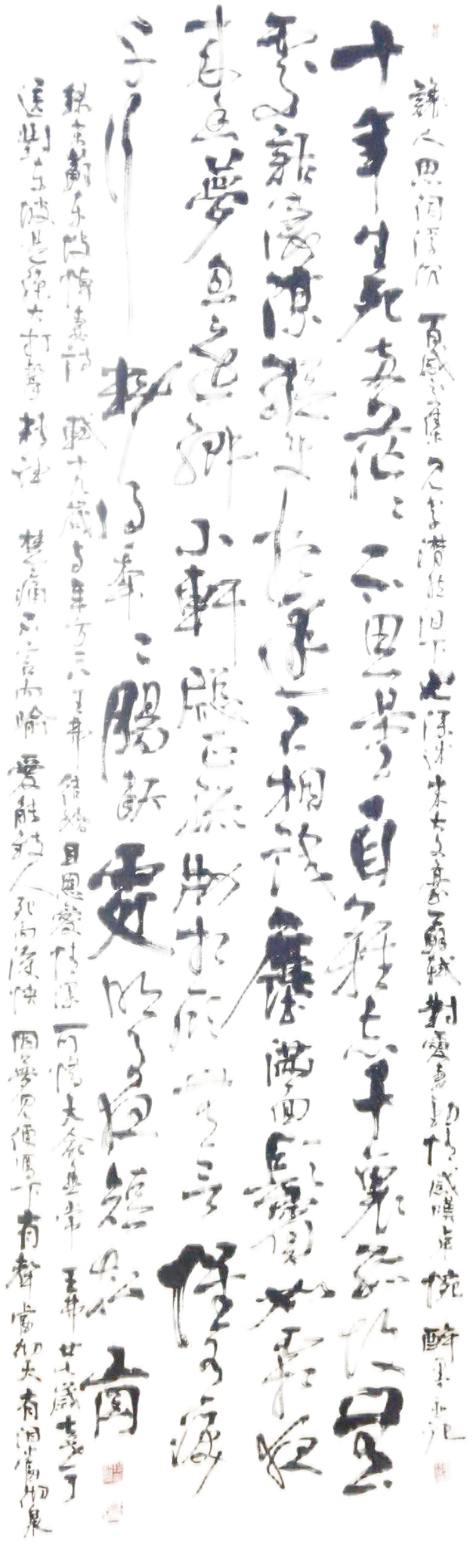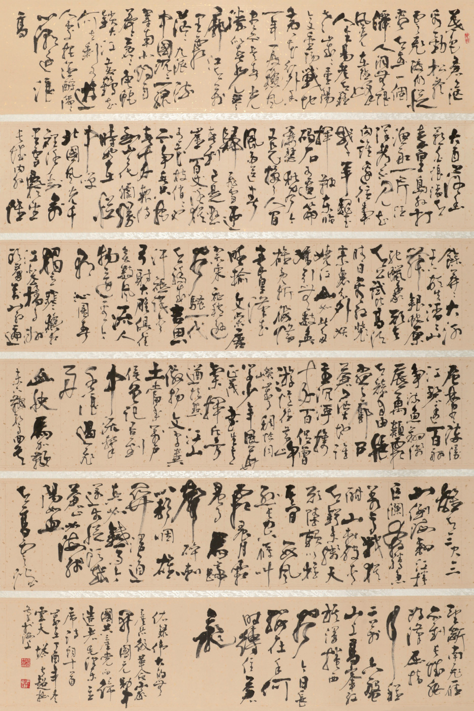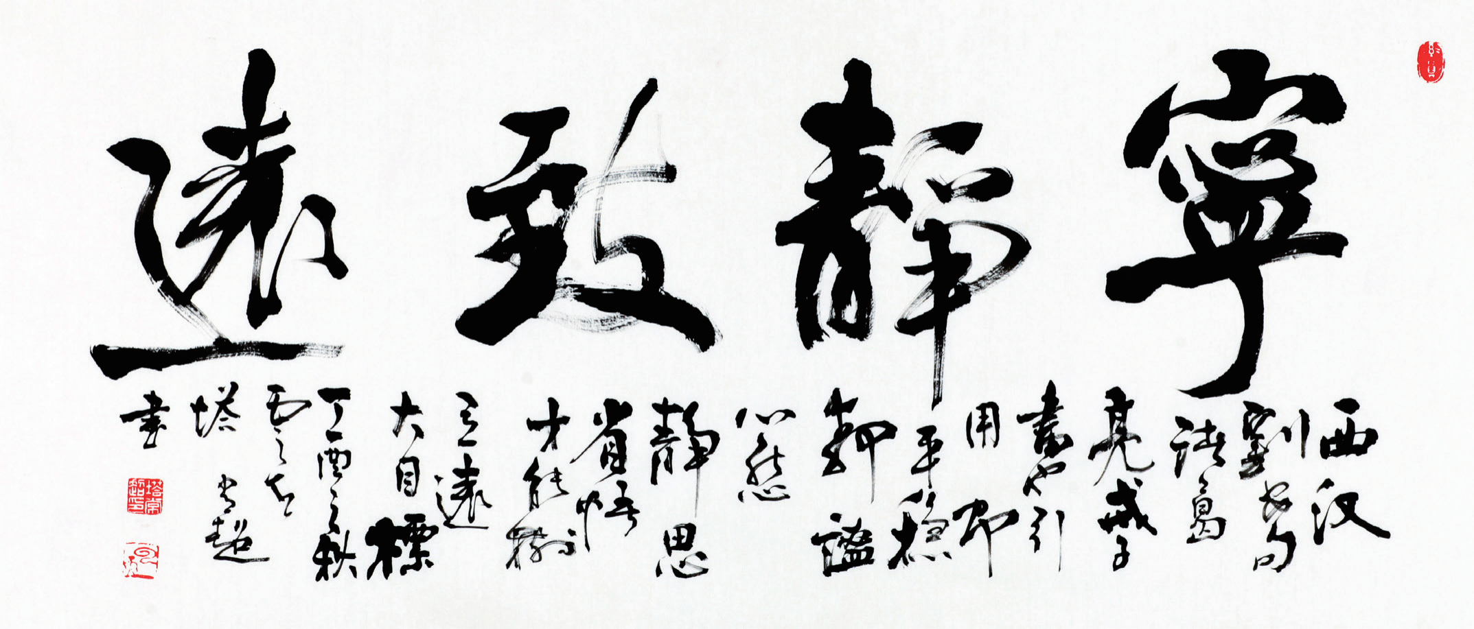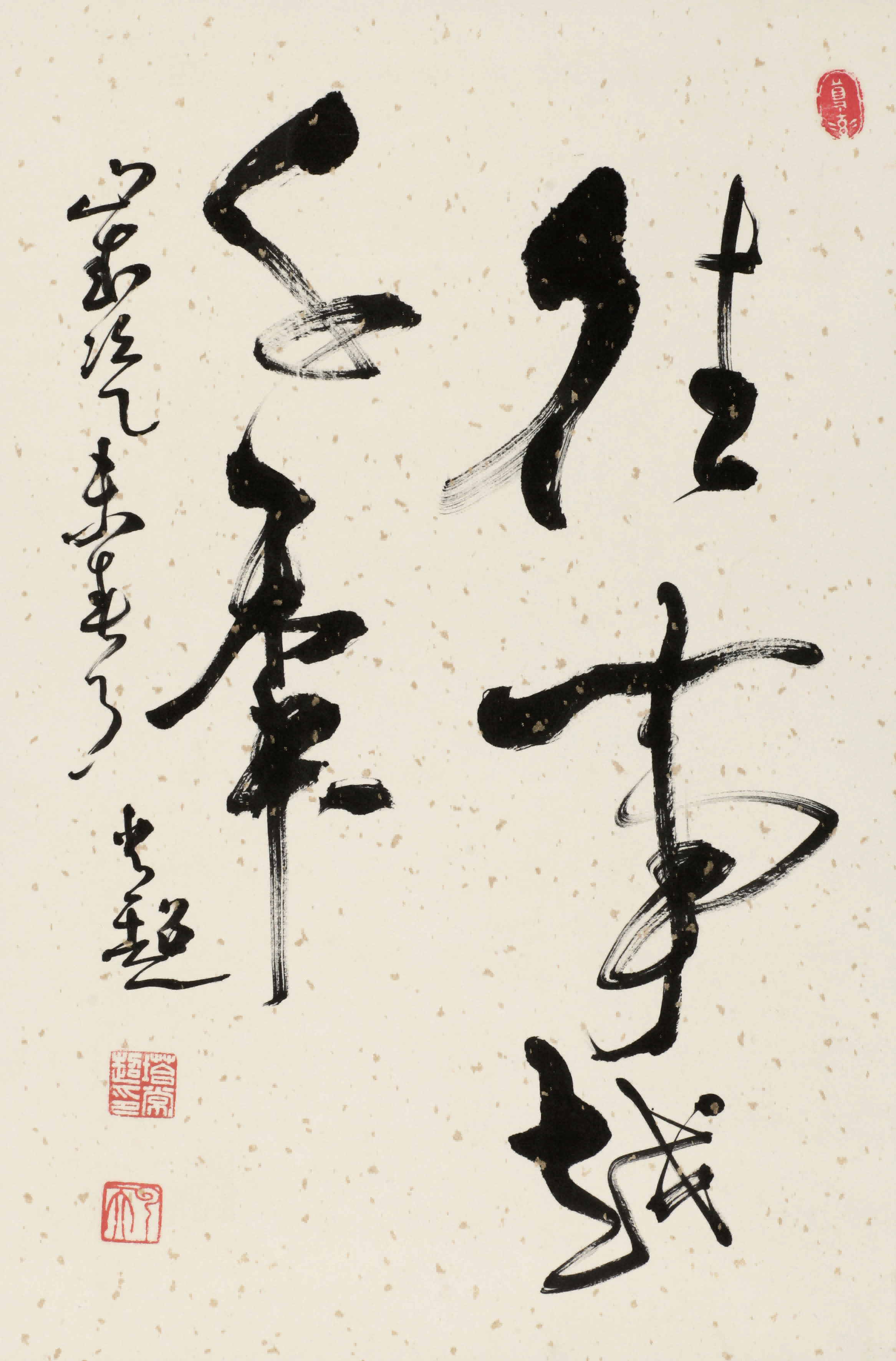 常超的行草书植根于二王,其清逸隽秀、刚健婀娜处正是二王之精髓。结体精到、点画幽微、章法善变,这些都是常超行草书的过人处,也正是从二王书体中采撷而来。但常超的脚步并没有停止在二王,而是顺着二王的文脉,上窥秦汉,以秦汉及其前的金文篆隶固其基;下及唐宋元明清,探索二王发展的源流。他抓住了几个点:唐颜真卿得二王之魂,尤其是《祭侄稿》,其迸发的情感震人心魄,而章法之不拘一格、腾跃变化、虚实流转,常超得之矣;而宋四家,尤其是米芾,他的字快马斫陈、纵横变化、八面出锋、沉着痛快,常超得之矣。因此他的书作皆具朴拙茂密之风,因而,许多同仁感叹:“观塔先生写字就是一种艺术享受。”