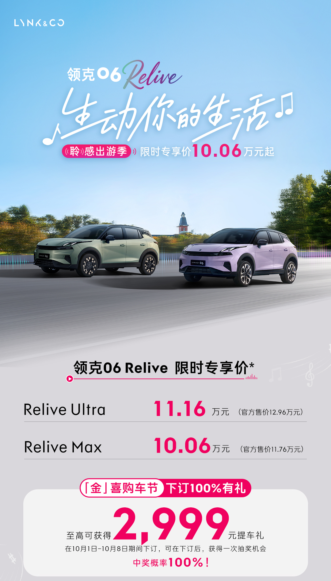 十月购车权益上,领克06 Relive推出多重福利:下订提车用户可享至高3000元限时出游补贴、10000元超享焕新补贴、5000元限时购车补贴;10月1日-10月8日下订且10月31日前提车,可获得一次抽奖机会,至高可得2999元提车礼,中奖概率100%。叠加权益后,其限时专享价仅10.06万元起。