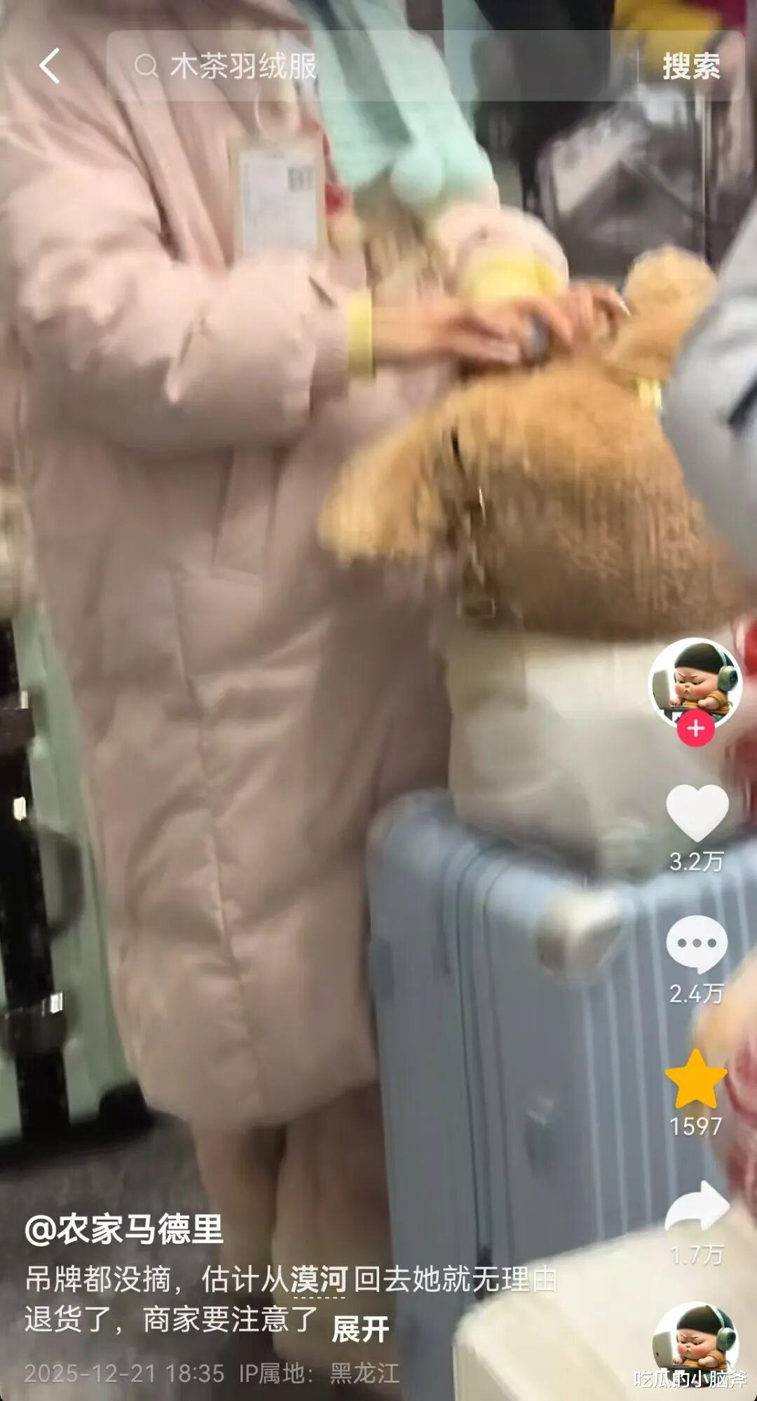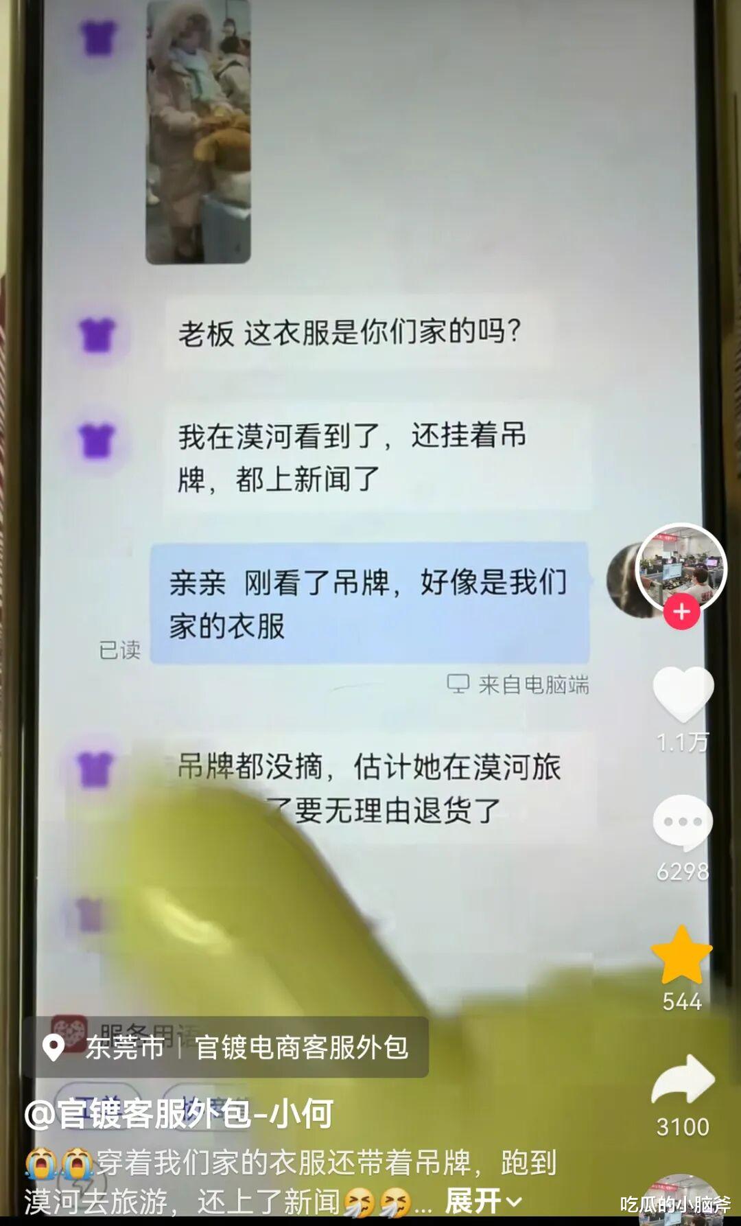 店家估计心态都崩了:好好卖货,没招谁没惹谁,自家衣服没剪吊牌就被穿到了漠河,绕了大半个中国,最后还要被退回。