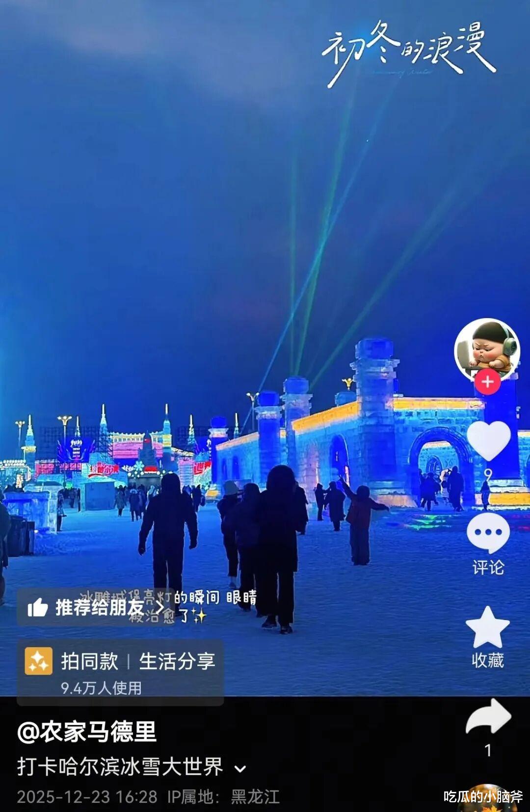 有个博主@农家马德里,南方人,前阵子跟风去东北“野性消费”,哈尔滨冰雪大世界、漠河都逛了个遍,旅途过得美滋滋。
