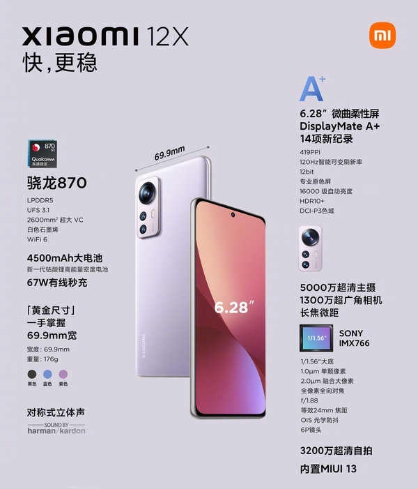 小米12X是一款主流的小屏旗舰,搭载骁龙870处理器,采用6.28英寸AMOLED曲面屏,性能和屏幕都非常不错,功耗低、屏幕小带来不错的续航体验,还有哈曼卡顿调教的对称式立体声扬声器、X轴线性马达、NFC、红外感应功能,在配置上不仅全面,还非常优秀。