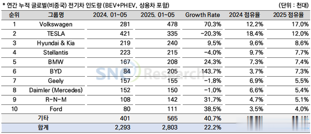 一、中国战队:比亚迪一骑绝尘,吉利需加把劲比亚迪:坐火箭式增长,直逼TOP 5!销量从去年同期的8.4万辆狂飙至20.5万辆,增速高达143.7% —— 在Top 10里妥妥的增速冠军!市场份额从3.7%跃升到7.3%,排名从第9跃升至第6(稳住的同时,距离第5名宝马仅差3000辆!一步之遥!)。欧洲、东南亚遍地开花,这扩张速度,让传统大佬们直呼“压力山大”!吉利:小遇瓶颈,期待后劲销量微降1.8%(15.7万 -> 15.5万辆),和特斯拉成了Top 10里唯二的“难兄难弟”(都在跌)。市场份额从6.9%略滑至5.5%,排名保持第7。海外电车的牌该怎么打?吉利或许需要掏出更多“新王牌”了。二、巨头变局:大众登顶,特斯拉宝座不保大众集团:逆袭成功,新晋销冠! 销量暴涨70.3%(28.1万 -> 47.8万辆),份额从12.2%冲到17.0%,成功把特斯拉拉下马,坐上头把交椅。欧洲主场,电动化全面发力,效果杠杠的!特斯拉:有点“秃”然,增长熄火?销量下滑20.3%(42.1万 -> 33.5万辆),成为Top 10里“跌得最惨”的选手。市场份额从18.4%骤降到12.0%,痛失冠军宝座。产品更新慢半拍?还是中国军团太猛了?马斯克得想想招了!现代起亚:稳字当头销量小增9.5%(21.9万 -> 24.0万辆),份额微调到8.6%,稳坐季军位置。表现淡定,但增速跑输了大盘(22.2%),还得加加油。Others:有人欢喜有人愁Stellantis:小跌4%(22.3万 -> 21.5万辆),份额掉到7.7%,排名第4。宝马:增长24.3%(16.7万 -> 20.8万辆),份额7.4%排第5,屁股后面被比亚迪追得发烫!奔驰:微降1%(15.2万 -> 15.0万辆),份额5.4%排第8,稳住就好。
