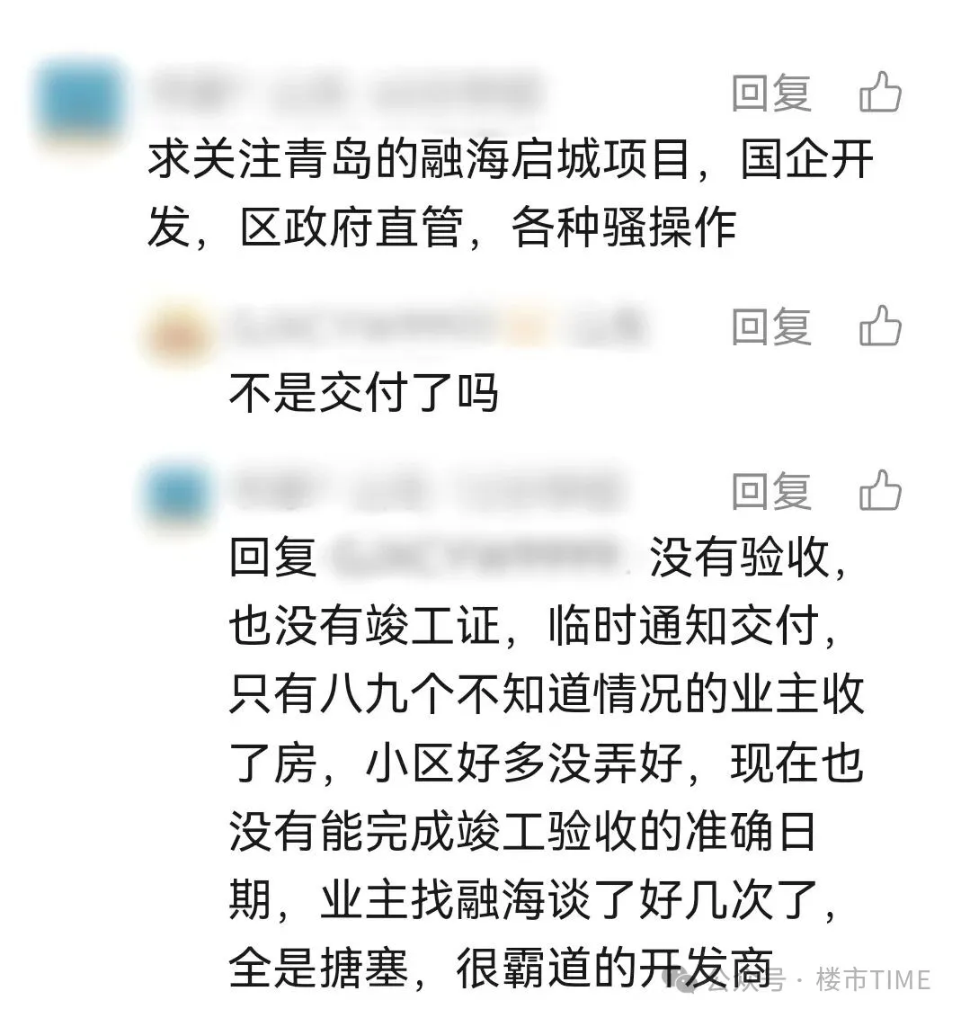 一些业主认为,开发商是为了逃避违约责任而“强行交房”,因为按照合同约定的交付节点,逾期一天就要赔付一天的违约金。现在表面上房子算“交”了,但实则问题成堆,业主怎么敢收?融海启城“交房了,但好像又没交房”,一度成为青岛楼市的热议梗。